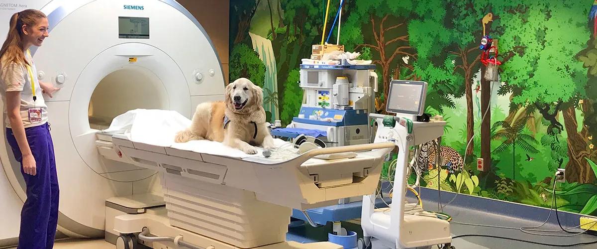 If kids are still nervous, Stephanie brings out the program’s real MVP: a golden retriever named Boots. “He can lay on the bed, slide inside the bore and show them how to hold still,” Stephanie says. “They’re usually willing to get on the table once they’ve seen Boots do it!”